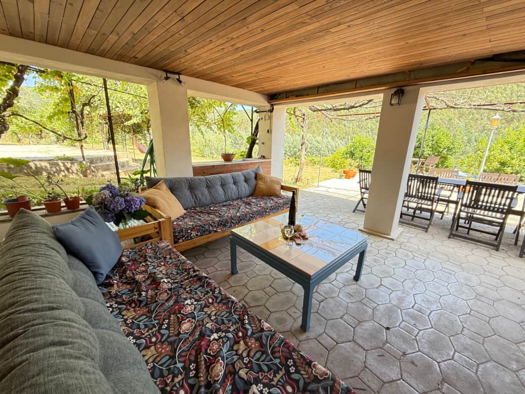 The house features beautifully furnished bedrooms, inviting shared living areas, and a generous dining room ideal for long meals and relaxed gatherings. A charming wine cellar–style room creates a unique social space, perfect for evenings of conversation, games, or unwinding together.