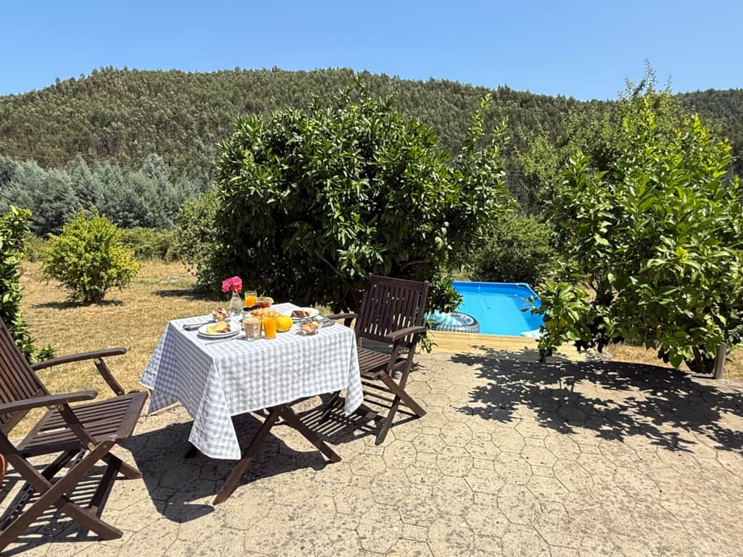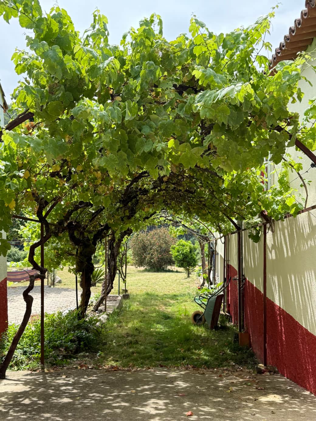 Guests can enjoy shaded terraces, garden seating, a pool area with views across rolling hills, and peaceful corners for reading or resting under the vines.